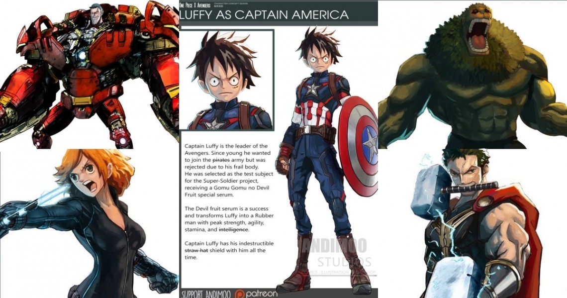 Andimoo ศิลปินจากสิงคโปร์ได้ทำการสร้างสรรค์ภาพชุด One Piece x Avengers โดยเป็นการนำตัวละครกลุ่มหมวกฟางแต่ละคนมาสวมบทเป็นสมาชิกอเวเจอร์ส โดย ลูฟี่ รับบทเป็นกัปตันอเมริกา,โซโล รับบทเป็นธอร์,อูซฟ รับบทเป็ฮอว์คอาย,นามิ รับบท Black Widow,นิโคล โรบิน รับบท มาเรีย ฮิลล์,บรู๊ค รับบท คัลสัน,ซาโบ รับบท บัคกี้,เพโรน่า รับบท สการ์เล็ต วิทช์,ช๊อปเปอร์ รับบท ฮัลค์,แฟรงค์กี้ รับบท IRON MAN และซันจิ รับบท นิค ฟิวรี่