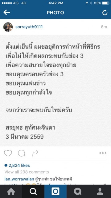 นายสรยุทธ สุทัศนะจินดา ประกาศยุติบทบาทหน้าที่พิธีกรในรายการเรื่องเล่าเช้านี้แล้ว ผ่านทางอินสตาแกรมส่วนตัว