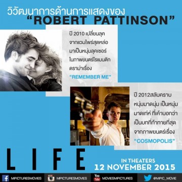 ในภาพยนตร์เรื่อง LIFE โรเบิร์ต แพททินสัน รับบท เดนนิส สต็อก (Dennis Stock) ช่างภาพชื่อดัง ที่ได้ตามติดชีวิตของ เจมส์ ดีน เพื่อถ่ายภาพมาลงนิตยสาร ผลงานการกำกับภาพยนตร์โดย อังตง กอร์เบจ์น ที่เคยฝากฝีมือมาแล้วจากภาพยนตร์เรื่อง Control โดยได้ เอียน แคนนิ่ง (IAIN CANNING) และ เอมิล เชอร์แมน (EMILE SHERMAN) ผู้อยู่เบื้องหลังภาพยนตร์ออสการ์เรื่อง The King’s Speech มาร่วมเป็น Producer ของภาพยนตร์เรื่องนี้