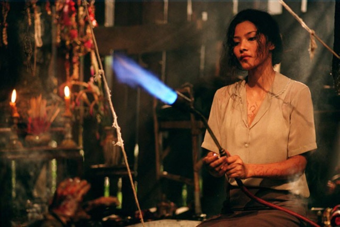 ฉากครูพนอใช้ไฟเผาขาแบบสดๆ จากนั้นก็เอาผ้าชุบน้ำรูดขาทำความสะอาดเพื่อพาไปอยู่กับท่านเทพสามตา