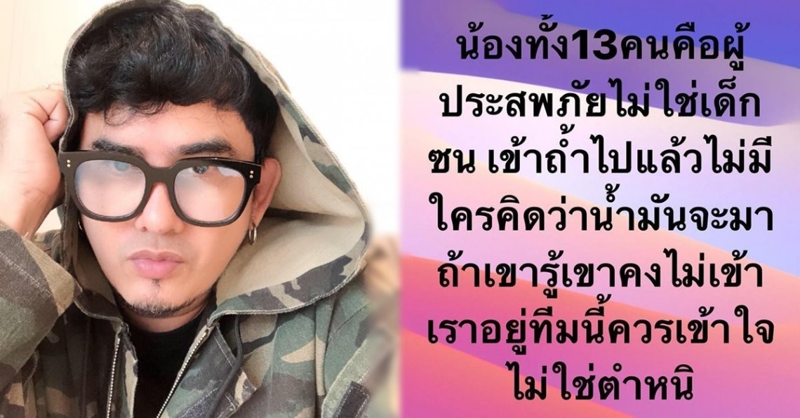 นอกจากนี้ยังได้แสดงความคิดเห็นว่า จากกรณีถ้ำหลวงน้องทั้ง13คนคือผู้ประสบภัย ไม่ใช่เด็กซน เข้าไปถ้ำแล้วไม่มีใครคิดว่าน้ำมันจะมาถ้าเขารู้เขาคงไม่เข้า..เราอยู่ทีมนี้ควรเข้าใจไม่ใช่ตำหนิ ข้อดีถ้าน้องๆไม่ติดอยูในถ้ำเราก็จะไม่ได้เห็นภาพคนไทยรักกันสามัคคีกันขนาดนี้