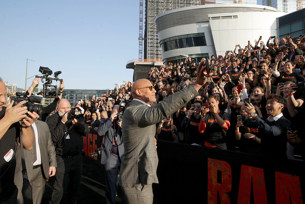 ดเวย์น จอห์นสัน นำทัพนักแสดง อาทิ นาโอมี แฮร์ริส, มาลิน เอเคอร์แมน, เจค ลาซี, เจฟฟรีย์ ดีน มอร์แกน, โจ แมนเกนเนโล่ พร้อมด้วยผู้กำกับ แบรด เพย์ตัน และผู้อำนวยการสร้าง โบ ฟลินน์ บุกไปถึงประเทศสหรัฐอเมริกา ร่วมงานพรีเมียร์เปิดตัว "Rampage - ใหญ่ชนยักษ์" ภาพยนตร์แอคชั่นผจญภัยสุดยิ่งใหญ่จากวอร์เนอร์ บราเธอร์ พิกเจอร์ส ที่จัดขึ้น ณ ลอสแอนเจลิส รัฐแคลิฟอร์เนีย