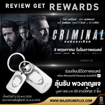 ใครไปดูมาแล้วเข้ามารีวิวภาพยนตร์ที่ พร้อมติด แฮชแท็ก #ReviewGETRewards และ #Majorfriends เพื่อลุ้นรับของรางวัล โดยรีวิวที่โดนใจทีมงานมากที่สุด ลุ้นรับพวงกุญแจที่ระลึกจากภาพยนตร์ Criminal คนสมองเดือด 20 รางวัล รางวัลละ 2 ชิ้น