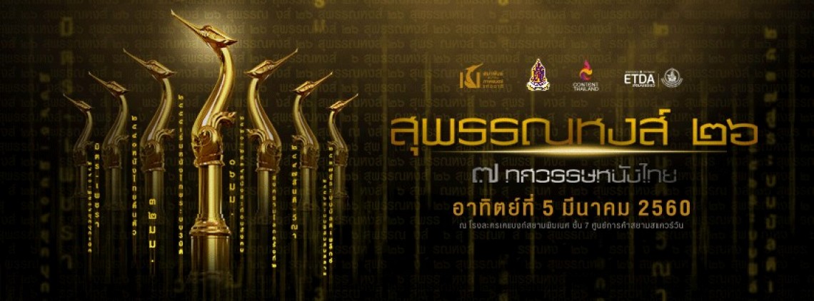 งานสุพรรณหงส์26 กำหนดให้มีงานประกาศผลรางวัลในวันอาทิตย์ ที่ 5 มีนาคม 2560 นี้ ณ โรงละครเคแบงก์สยามพิฆเนศ ชั้น 7 สยามสแควร์วัน โดยจะถ่ายทอดสดทางช่องเวิร์คพอยท์ กดหมายเลข 23 เวลา 4 ทุ่มตรง