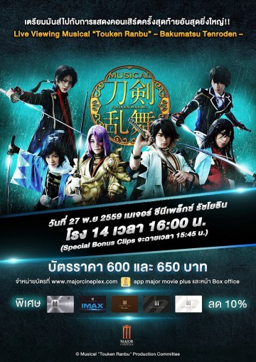การแสดงมิวสิคัล “Touken Ranbu” ได้เริ่มเปิดการแสดงที่โรงละคร AiiA 2.5 ณ กรุงโตเกียว ตั้งแต่เดือนตุลาคมที่ผ่านมา เมเจอร์ ซีนีเพล็กซ์ จึงไม่พลาดที่จะเปิดโอกาสให้แฟนคลับชาวไทยได้เข้าไปสัมผัสบรรยากาศ และมีส่วนร่วมในความยิ่งใหญ่ กับการแสดงรอบสุดท้าย ที่จะถ่ายทอดสดมาให้ชมกันในโรงภาพยนตร์ เมเจอร์ ซีนีเพล็กซ์ สาขารัชโยธิน ในวันที่ 27 พฤศจิกายน 2559 โรงภาพยนตร์ที่ 14 เวลา 16.00 น. โดยจะมีการจัดฉาย Special Bonus Clips ให้ชมกันก่อนในเวลา 15.45 น. อีกด้วย สามารถจองบัตรเข้าชมผ่านช่องทางเคาน์เตอร์บ๊อกซ์ออฟฟิศ โรงภาพยนตร์เมเจอร์ซีนีเพล็กซ์ สาขารัชโยธิน / www.majorcineplex.com และแอปพลิเคชัน Major Movie Plus บัตรราคา 600 และ 650 บาท